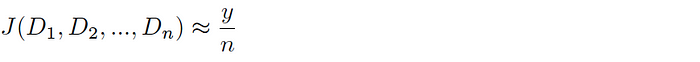 Assuming we have a uniform hash function h(Dᵢ), you can say that the kᵗʰ smallest hash values represent a random sample of the total space of possible hash values for this dataset (and likewise, the kᵗʰ smallest values across all hashed Dᵢ is a random sample of the global hash space). Given a total tally of elements hashing to the kᵗʰ smallest hash values y, the Jaccard index is estimated as follows: