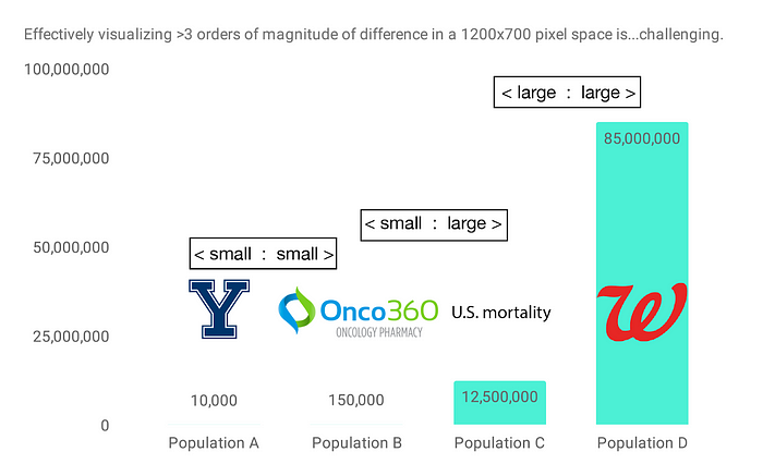 Returning to the datasets in our concocted scenario at the top of the post, let’s say we have 12.5 million mortality records, Onco360 is filling prescriptions for 150,000 individuals, and our hypothetical Yale study includes 10,000 participants. Walgreens has 85 million active MyWalgreens members. By clinical trial standards, this study would be on the larger side, but compared to the number of people having prescriptions filled at Walgreens, 10,000 individuals is quite a small number: