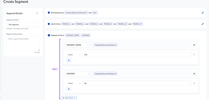 Recently, my team developed a new self-serve UI for customers to segment data. Given a dataset, our users may want to pull specific rows and columns from that dataset, sometime in relation to other datasets. Pulling a segment might mean, for example, pulling only the columns that contain Datavant tokens from a dataset, specifically for the rows where the patient is male and from California.