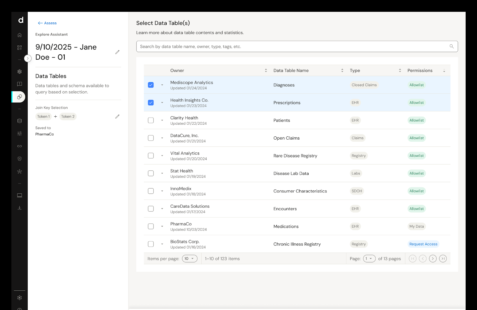 By registering tokenized datasets within their own AWS environment, data sources become passively discoverable to potential buyers—without moving or exposing underlying data. Explore Assistant surfaces available data tables, ownership, table types, and permissions, allowing buyers to evaluate options securely and efficiently.