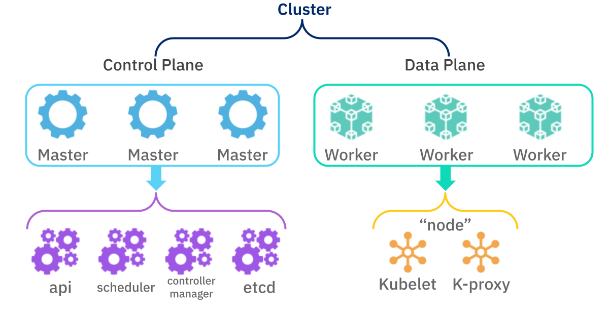 Each Cluster is divided into a Control Plane, containing Master components, and a Data Plane, containing Worker components across our virtual computers: