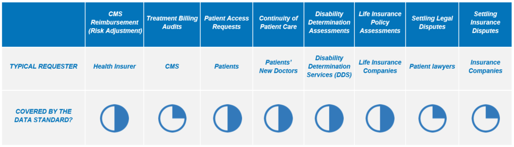 Many valuable uses of patient data require access to the full record. Below is a brief summary of how many necessary elements the data standards cover for different use cases: