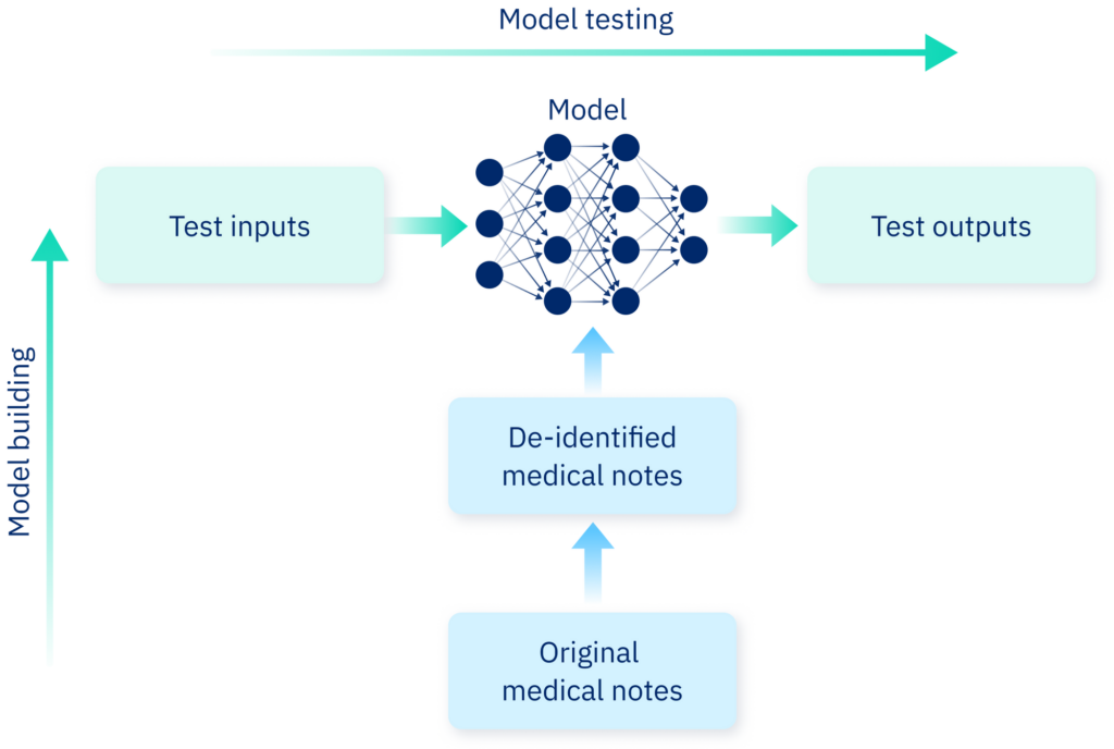 Representation of model building and testing. Along the vertical axis: medical notes are de-identified before being fed to a large language model for training. Along the horizontal axis: The model is tested by inputting a range of possible texts, and evaluating the output.