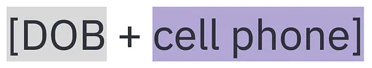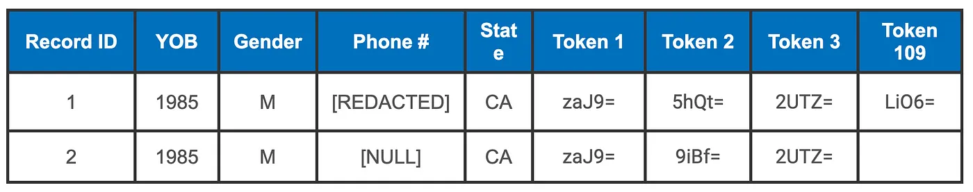 Record 2 is missing information in the Phone # field and because of that we’re also missing a token that uses Phone # in its definition. Here, 2 token pairings match, 1 token pairing does not, and 1 token pairing is unknowable. There is an upper limit to how certain we can be that these two records match based on comparing these tokens. Better quality tokens would offer more certainty.