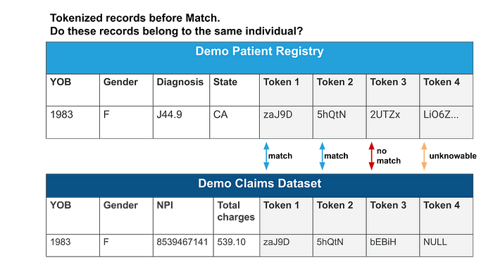 With Match, an interested researcher no longer needs to devise their own means to compare many columns of tokens in order to determine if multiple records match a single individual. It also further eliminates the need to worry about why one dataset may only have 2 tokens applied to it and another dataset may have 3 or 4 tokens applied to it.