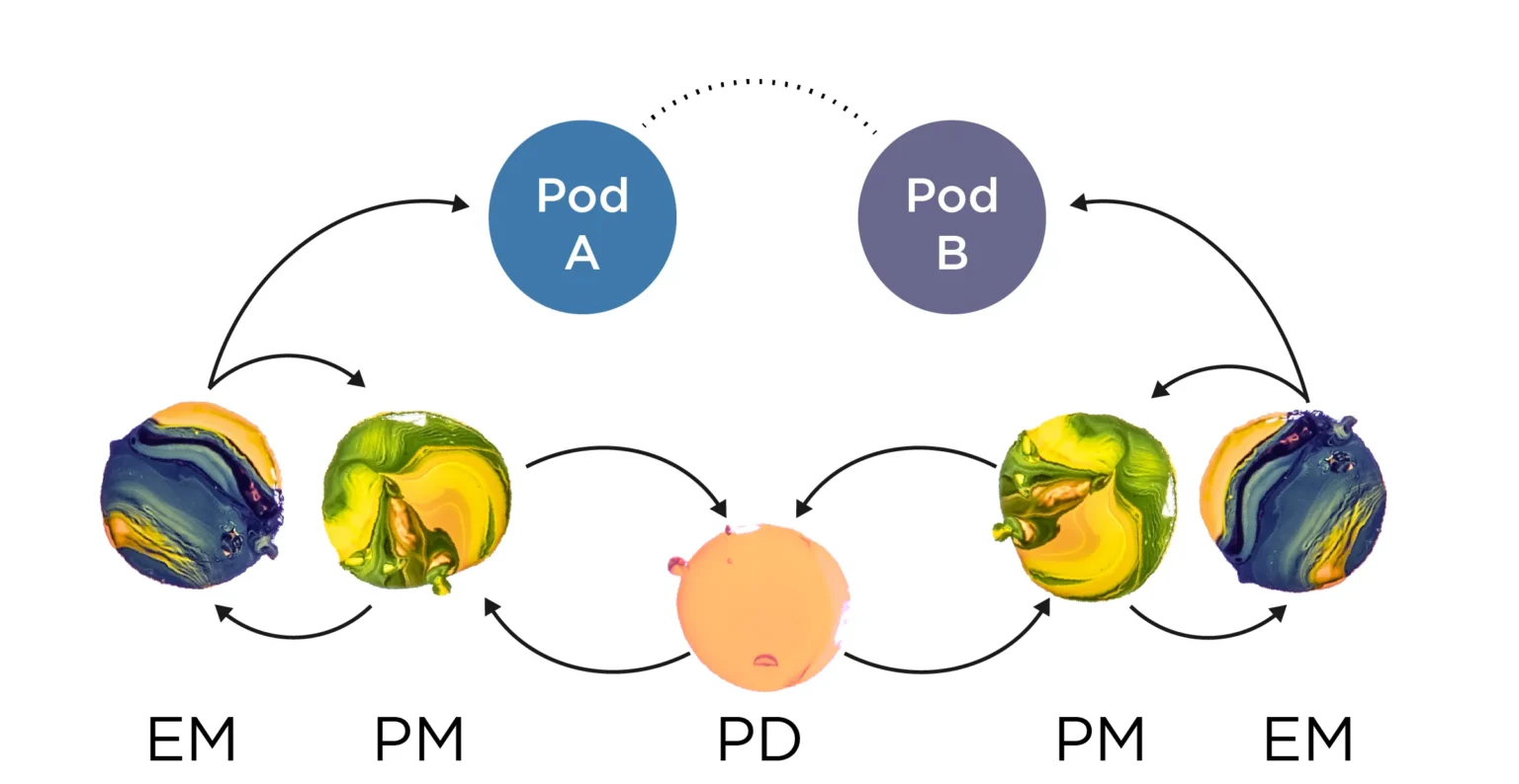 In the diagram on the left, both Pods can hit their business goal independently of the other Pod. If both Pods succeed while also encouraging a fluid exchange between them, then the end product will be better.
