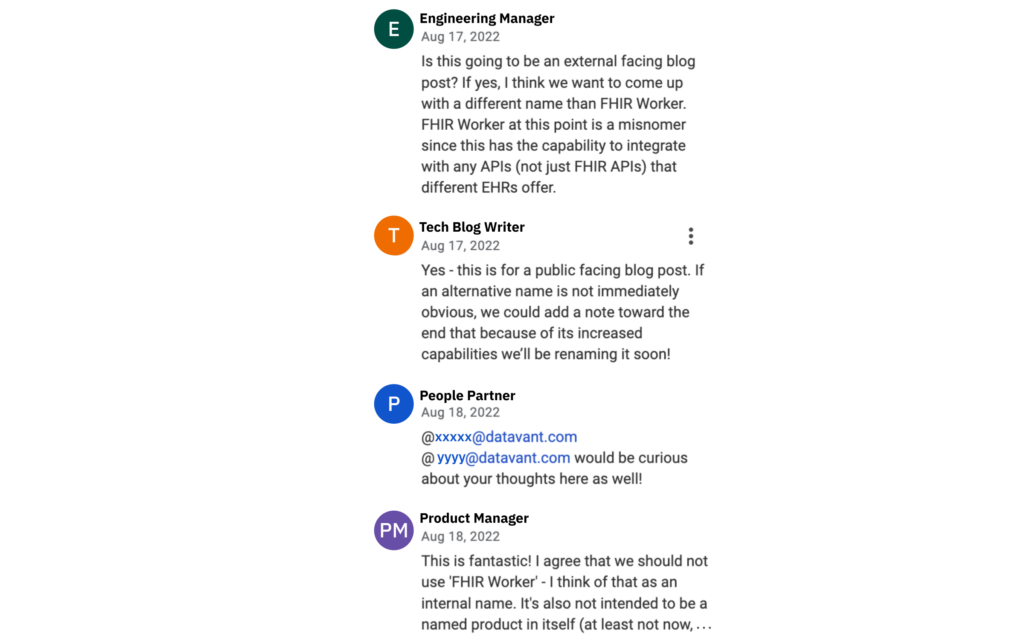 Datavant is intensely committed to internal transparency. “Access” doesn’t just mean access to your specific corner of Github and your specific team’s working drive. Salaried employees with shared drive access can comb through financial reports, org charts, vision docs, Board presentations, product demos, and retrospectives diagnosing issues and responses. And because we are an async-first culture, it’s also possible, in many cases, to follow archived discussions through the comment threads within these documents: