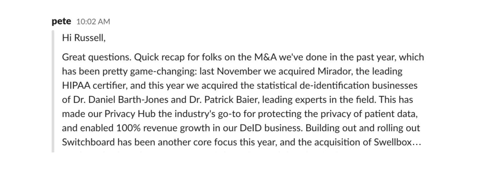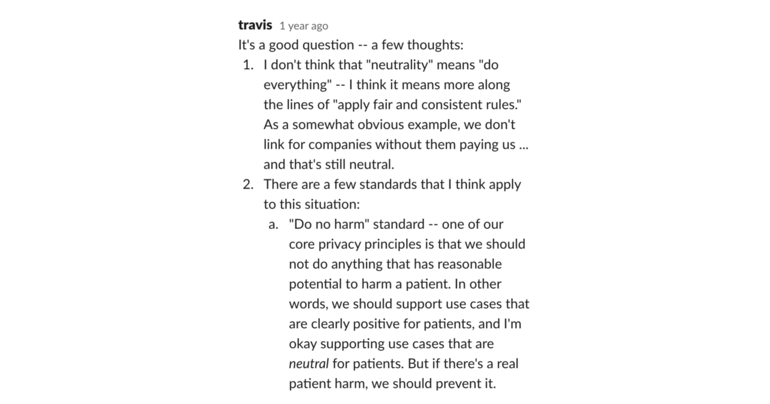 In my discussion of the Datavant Onsite Interview, I mentioned looking for red flags and weak links — any sign that the actual culture inside the company did not live up to the way it was being described. I continued my probing even after officially joining. I requested meetings with every leader whose name came up repeatedly in conversations. Everybody met with me and took my questions seriously. I dropped a ridiculously lengthy question about the philosophical and business implications of our “neutral & ubiquitous” stance in the CEO’s #AskMeAnything Slack channel. He responded with an impressively articulate response about how he understands both “neutral” and “ubiquitous” and how he sees these ideas playing out in day-to-day operations.