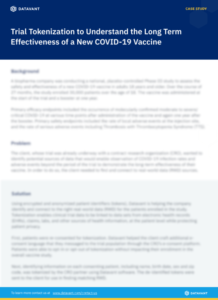 Download our case study to learn how this client is using Datavant to tokenize their trial data and connect it to real-world data to complete their evaluation of the vaccine’s safety and effectiveness.